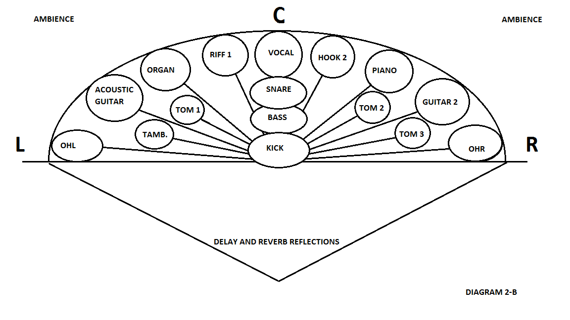 not every track needs to be humping the center of the mix. Let the lead actors play the lead roles. There is no room for EGO in the mix. This rule applies not only to PANAORAMA aka ‘panning’, but to frequencies as well… (Refer to diagrams 2-A & 2-B; and 3-A & 3-B as your jump off.) I have these printed out for myself and fill them in while mixing as my guideline. You’ll be surprised how much this will help your mix).