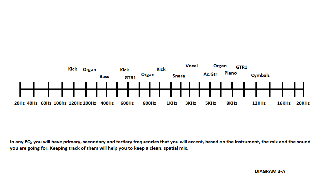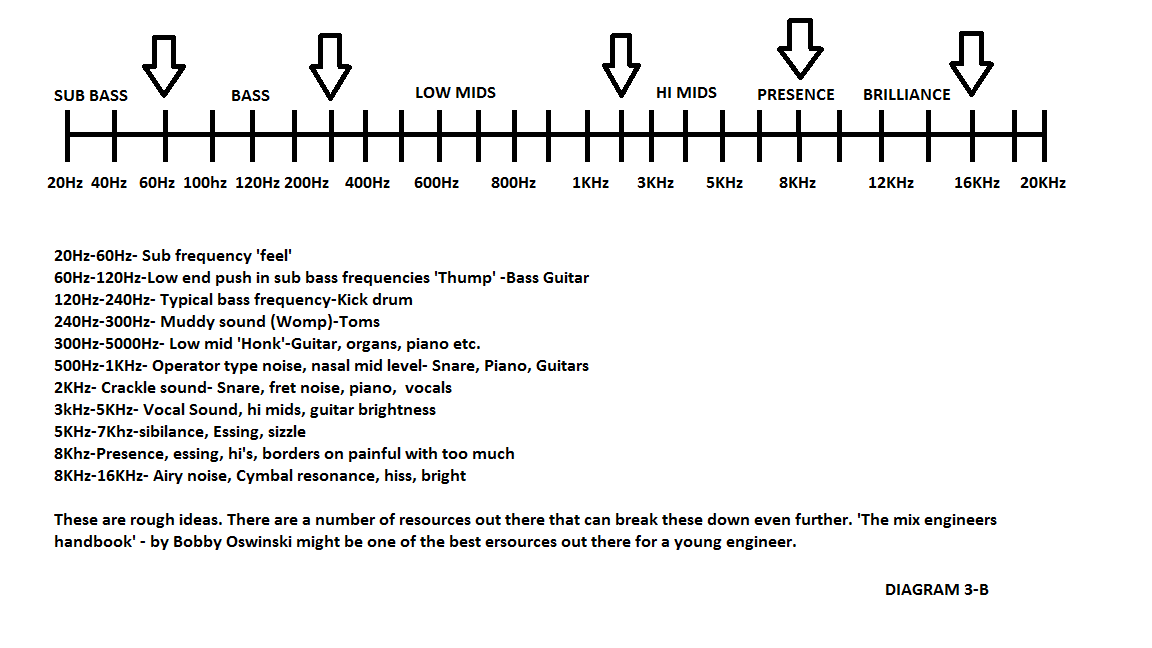Whenever you are sitting down to begin a mix, there are a few things you should consider and also be aware of. The song you are about to approach is, in a sense a storyline that you need to bring to life. In the spirit of this, visualize a painting of a landscape. (diagram 1) While this is a crude picture, and perhaps oversimplified, the point remains valid, in that you are setting a scene, telling a story, and providing a front row seat to the artist’s tale. This should not be taken lightly, and should be artfully crafted and sculpted with the utmost respect for the process. Now this does not mean you need to be a weathered engineer to the masses. It DOES, however mean that you need to do what your mama always told you, and put ‘your listening ears’ on!